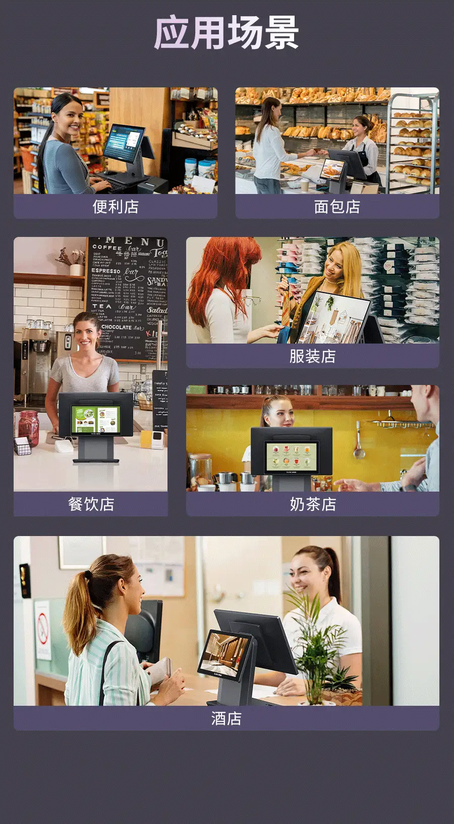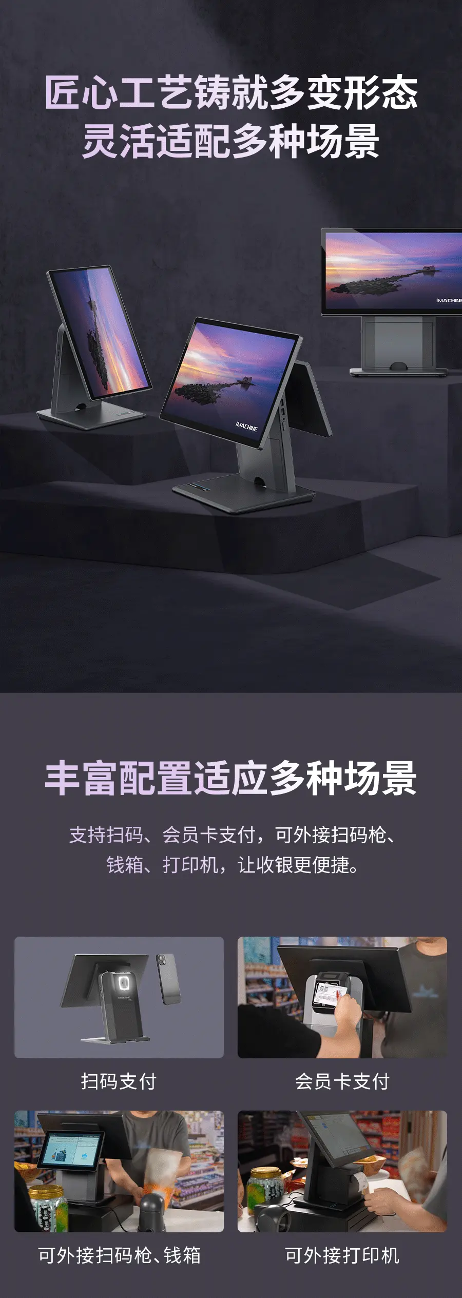 功能集成度超高,小巧不占地 性能大突破,双屏配置更高效 内置170mm/s高速打印机,结算无需等待 丰富的外设接口,满足更多场景需求